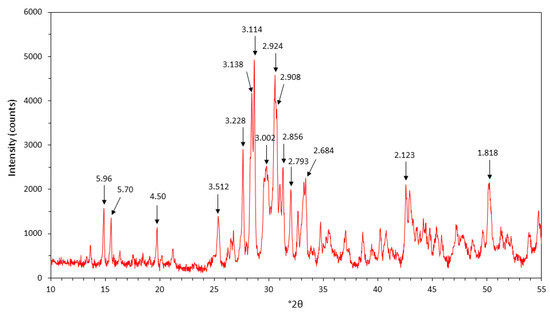 Powder X-ray diffraction data (Figure 3 and Table 4) were collected with a PANalytical X’Pert3 powder diffractometer equipped with an X’celerator silicon-strip detector and operated at 40 mA and 45 kV (CuKα-radiation, λ = 1.5406 Å). Bragg peak positions were determined with the PANalytical HighScorePlus 4.6 software (Malvern Panalytical, Kassel, Germany) and corrected against an external Si standard (NBS 640b). Monoclinic unit-cell parameters refined from the powder data are a = 6.7408(8) Å, b = 13.0133(15), c = 12.0649(20) Å, β = 98.504(13)° and V = 1046.67(17) Å3.