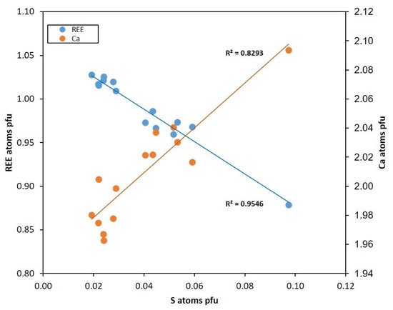 The chemical composition obtained from structure refinement (Table 6) of kesebolite-(Ce), Ce0.96Ca2.04Mn1.00(As0.72Si0.28)Si3O13, is in reasonably good agreement with the above empirical formula. The calculated bond valences (Table 8) confirm the overall structural model. As discussed above, the average T1-O bond distance of 1.656 Å is rather short when compared to what is expected from a pure, tetrahedrally coordinated As5+-site (around 1.69 Å; [23]), but explained by the incorporation of smaller ions (Si4+ and minor amounts of P5+ and S6+) replacing As5+. The crystal-chemical role of hexavalent S should be noted. There is a clear antipathetic variation of S vs. REE in kesebolite-(Ce) and sympathetic S vs. Ca (Figure 6), indicating the occurrence of the heterovalent substitution mechanism REE3+ + As5+ → Ca2+ + S6+. The zonation pattern seen in the BSE images of kesebolite-(Ce) (Figure 2) is mainly related to this coupled variation. SO42−-for-AsO43− replacement is not very common in minerals but has been documented, e.g., members of the tsumcorite group [24] and for synthetic jarosite [25] and ettringite [26].