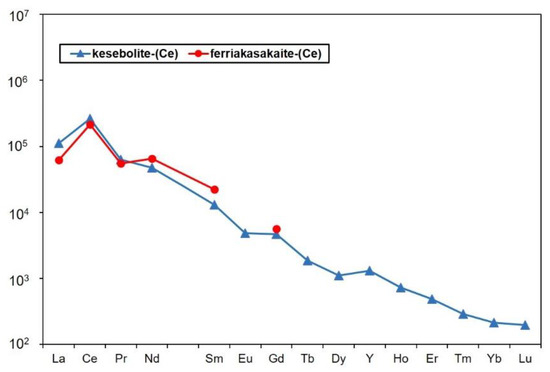 Chondrite-normalized REE pattern for kesebolite-(Ce) compared with ferriakasakaite-(Ce) based on ICP-MS analyses. Chemical data for ferriakasakaite-(Ce) from Kesebol (EPMA-WDS data) are taken from [10].