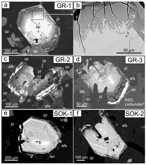 BSE images of the studied allanite grains. (a) Allanite grain GR-1 with a large preserved core, oscillatory mantle, and zones 3a, 3b, and 3c; (b) a close-up view of the worm-shaped contact between the core and the mantle; (c) allanite grain GR-2 with characteristic wavy zonation in the mantle and numerous 3b zones; (d) allanite grain GR-3 with small remnants of the core, the mantle, and a rim composed of zone 3b; (e) allanite grain SOK-1 with preserved core, the mantle, and a rim composed of zone 3a; and (f) allanite grain SOK-2 with the mantle and zones 3a and 3b. Mineral abbreviations are as follows: qz—quartz, afs—alkali feldspar, pl—plagioclase, ep—epidote, ap—apatite, and bt—biotite. The zones described in the text are annotated in selected grains in Figure 2.