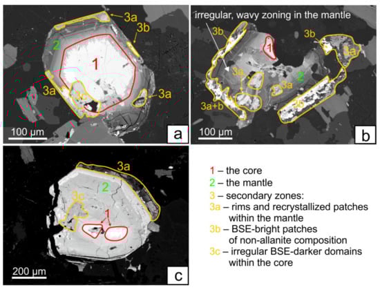 Selected allanite grains with marked textural zones 1 to 3; (a) GR-1, (b) GR-2, and (c) SOK-1.