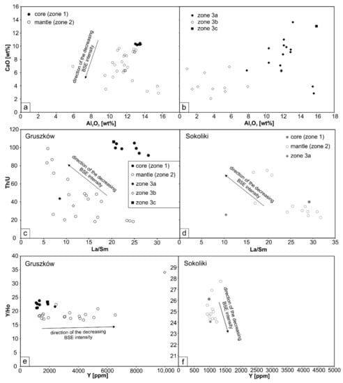 Variation diagrams illustrating the compositional differences between the distinguished textural groups; (a,b) Al2O3 vs. CaO [wt %], (c,d) La/Sm vs. Th/U [ppm], and (e,f) Y [ppm] vs. Y/Ho. Gruszków and Sokoliki samples are presented together in (a) and (b), as differences in major element contents are insignificant. The arrows in plots (a,c) and (e) show the evolution of element concentrations as BSE-intensity decreases.
