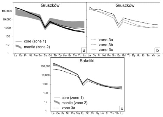 Chondrite-normalized rare earth elements (REE) patterns of all textural groups. Gruszków and Sokoliki allanites are presented separately. Normalizing values are after Sun and McDonough [42]. (a) Zones 1 and 2 for Gruszków allanites; (b) Zone 3 for Gruszków allanites; (c) Zones 1 to 3 for Sokoliki allanites
