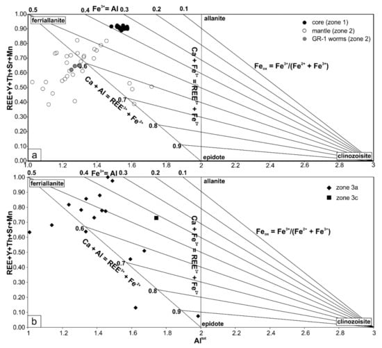 On the Altot vs. REE + Y + Th + Sr + Mn diagram, zone 2 shows large variations. The points are shifted towards and considerably beyond the ferriallanite-epidote join (with the dominance of ferriallanite for most points) (Figure 5a). It is important to note that the worm-shaped domains are located further from the core than the most points of the mantle. Most of the Gruszków mantle falls around the 0.6 Feox isoline, whereas the Sokoliki mantle is concentrated close to the 0.5 isoline. These values are significantly distinct from those calculated according to Armbruster et al. [39] but relatively close to those calculated on the basis of Petrik et al. [2] (Table 1 and Table S2).