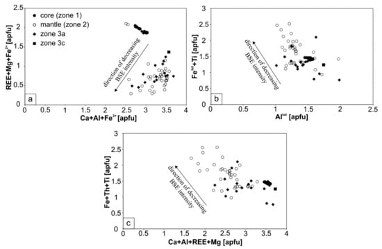 Although the core exhibits small variations in element concentrations, the main mechanism of element incorporation is clearly expressed by the following coupled substitution: Ca2+ + Al3+ + Fe3+ ⇿ REE3+ + Mg2+ + Fe2+ (Figure 6a). A slightly weaker correlation observed in diagrams shown in Figure 6b,c indicates minor participation of the substitutions mechanisms including Al3+ ⇿ Fetot + Ti4+ and Ca2+ + Al3+ + REE3+ + Mg2+ ⇿ Fetot + Th4+ + Ti4+, where Fetot is total Fe.