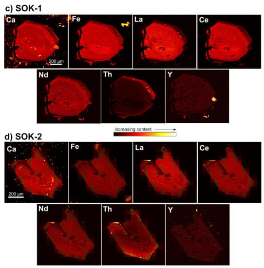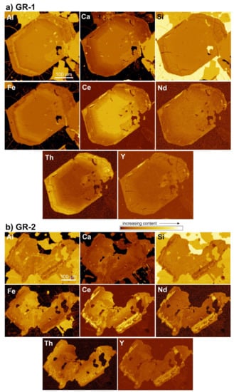 While the most drastic geochemical variations are observed along the core/mantle boundary (for both Gruszków and Sokoliki allanites), followed by a rather gradual element distribution within zone 2, a relatively sharp compositional change is also related to the youngest BSE-brighter zone of the Sokoliki mantles. The most significant variations involve an increase in Ca (mostly visible in distribution maps, Figure 7c,d), Sr, Nd–Gd, Si, Th, and Hf and a decrease in Al and La concentrations. Chondrite-normalized REE patterns are slightly LREE-depleted compared to the preceding mantle zones, resulting in lower La/Sm ratios (Figure 3d). Th/U ratios are significantly higher compared to the preceding mantle; however, they are lower than those of the core (Figure 3d).