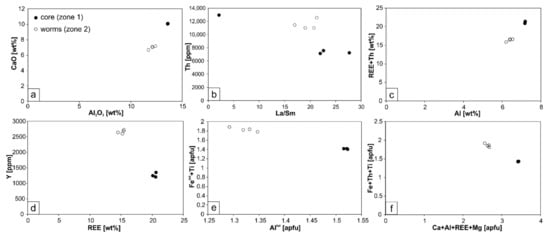 Binary plots showing most prominent compositional differences between the core (zone 1) and the worm-shaped domains of the mantle (zone 2). (a) Al2O3 vs. CaO [wt %]; (b) La/Sm vs Th [ppm]; (c) Al vs. REE + Th [wt %]; (d) REE [wt %] vs. Y [ppm]; (e) Altot vs. Fetot + Ti [apfu]; (f) Ca + Al + REE + Mg vs. Fe + Th + Ti [apfu].