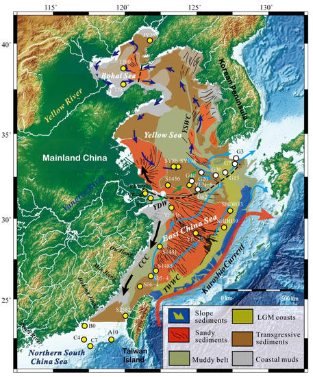 The sediment distribution in the ECSs is mainly controlled by the dynamic climate and ocean settings in the region [30,37]. According to the result of oceanographic observations, the surface and bottom current systems in the ECSs are strongly influenced by a large-scale anti-clockwise circulation in the western Pacific [38] (Figure 1). As a result, there are several persistent currents in the region, including the Kuroshio Current, Taiwan Warm Current (TWWC), Tsushima Warm Current, Yellow Sea Warm Current (YSWC) and the China Coastal Current (CCC). In contrast, the Yangtze Diluted Water Current (DWC) is stronger in summer than in winter. In addition to the ocean currents, there are very strong tidal currents and waves with the great axis of the tidal ellipse-oriented NW to SE in the East China Sea [39]. It is believed that sand ridges are formed in the areas with strong rectilinear tidal currents, sand sheets in areas are dominated by strong rotatory tidal currents, and clay sediments are deposited mainly in the areas of weak tidal currents [40].