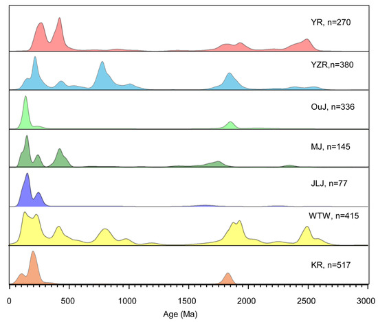 Normalized kernel density estimates (KDEs) of U-Pb age distribution in sediments of seven rivers flowing into the ECSs. The age numbers (n) are shown along the KDE distributions. Abbreviations: YR (Yellow River), YZR (Yangtze River), OuJ (Ou Jiang), MJ (Min Jiang), WTW (rivers in western Taiwan) and KR (Rivers in South Korea).