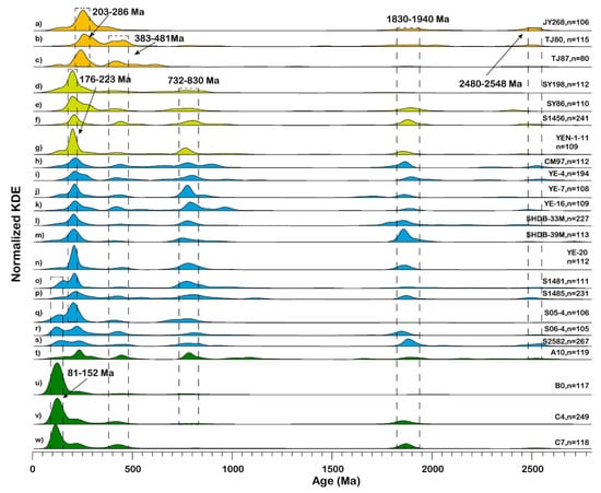 KDEs of detrital zircon U-Pb ages of in the ECSs. Different colors are used to represent the samples taken from different seas, with brown for the Bohai Sea (a–c), green-yellow for the Yellow Sea (d–g), blue for the East China Sea (h–s) and green for the northern South China Sea (t–w). The visually distinctive age populations are highlighted by the vertical dashed bars.