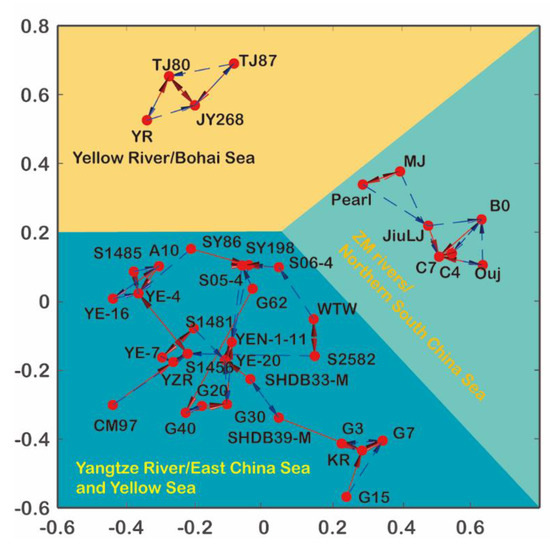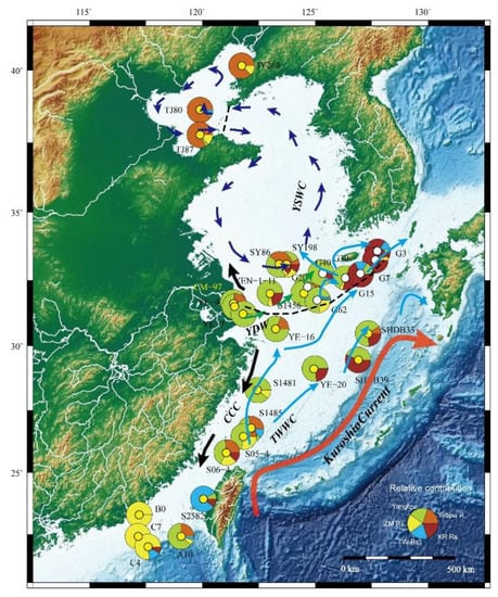 In contrast to samples taken from the other seas, which show clear source-to-sink connections, there exists a more complicated pattern for sediments in the East China Sea and the Yellow Sea (Figure 5). Despite of that, most samples exhibit good correlations with the Yangtze fluvial sediments as indicated by the first and second closest neighbor lines in Figure 5, which evidently suggest that sediments derived from the Yangtze Catchment have played a very important role in determining detrital zircon signatures over this very broad continental shelf. On the other hand, the very scattered points on the MDS plot for samples in the East China Sea also imply that the fluvial source signals have been modified in the shallow sea environment relative to the Yangtze fluvial source [20]. We consider that this pattern is related to the hydrodynamical system in the region, which will be discussed in detail in Section 5.3.