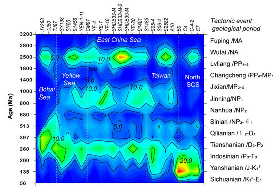 Different to the Bohai zircon ages, the presence of Neoproterozoic zircons is very typical in the Yellow and East China Sea. We think the Neoproterozoic zircons can be related to the formation of the basement of Yangtze Craton in the Jinning Orogeny during 700–900 Ma [70]. Although the high proportions of Paleozoic zircons in the Yellow and East China Seas appear to be similar to those in the Bohai Sea (Figure 7), the sporadic distribution of Mesozoic igneous rocks in the lower Yangtze due to the subduction of Paleo–Pacific plate to the Eurasian plate may have provided extra grains [48].