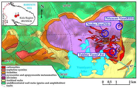 - Bulakh, A.G.; Ivanikov, V.V.; Orlova, M.P. Overview of carbonatite-phoscorite complexes of the Kola Alkaline Province. In Phoscorites and Carbonatites from Mantle to Mine; Wall, F., Zaitsev, A.N., Eds.; Mineralogical Society of Great Britain and Ireland: London, UK, 2004; pp. 1–43. ISBN 9780903056229. [Google Scholar]