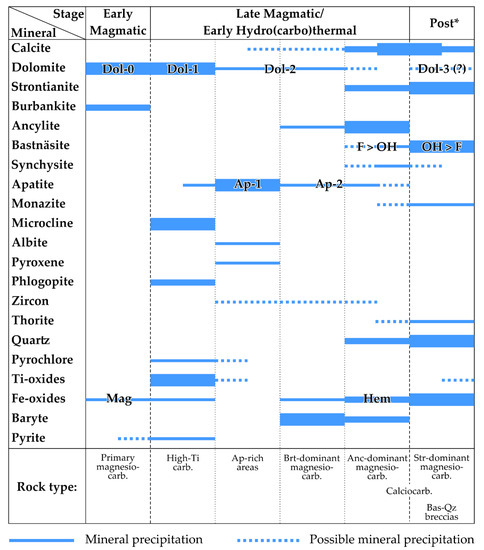 - Baryte-dominant (dolomite + baryte) and ancylite-dominant (ancylite–baryte–strontianite–calcite–quartz ± late Ca–Fe–Mg carbonates; “ancylite ores”) magnesiocarbonatites. Alteration of primary magnesiocarbonatites is caused by a magmatic S-rich fluid with high concentrations of Ba, Sr, and REE.
