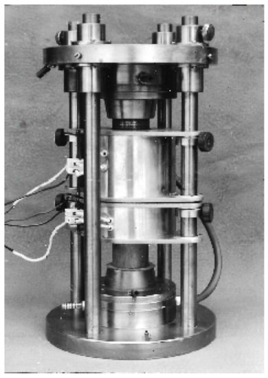 - Müller, H.J. Abschluß der Entwicklungs- und Fertigungsarbeiten zur Messung der Petroakustischen Parameter unter Höchsten Temperaturen mit Hilfe der Hydrostatischen 2,5 GPa-Anlage; Res. Report ZIPE; Central Institute for Physics of the Earth: Potsdam, Germany, 1985; pp. 45–50. [Google Scholar]