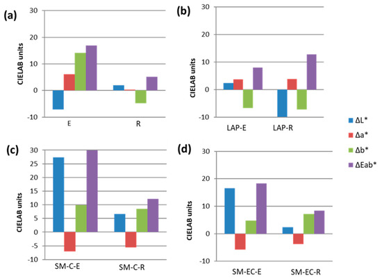 Figure 2. Variations in the color parameters (ΔL*, Δa*, Δb*, and ΔE*ab) of the paint and binder mock-ups after SO2 exposure. (a) Binder (E and R) mock-ups. (b) Lapis lazuli (LAP) mock-ups. (c) Smalt (SM) mock-ups with a coarse (C) grain size. (d) Smalt (SM) mock-ups with an extra-coarse (EC) grain size. Check Table 1 to better follow the paints labeling.