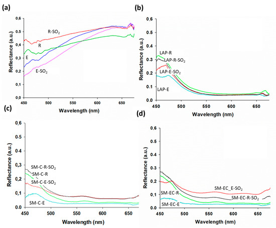 All of the paint mock-ups showed changes in their reflectance values after being exposed to SO2 (Figure 3). However, these changes varied from one paint to the other, as was also noticed in the binder mock-ups (Figure 3a). Thus, in the R-mock-up, reflectance increased across the whole spectrum, but, in the E-mock-up, a decrease was recorded above all in the region from 450 to 600 nm.
