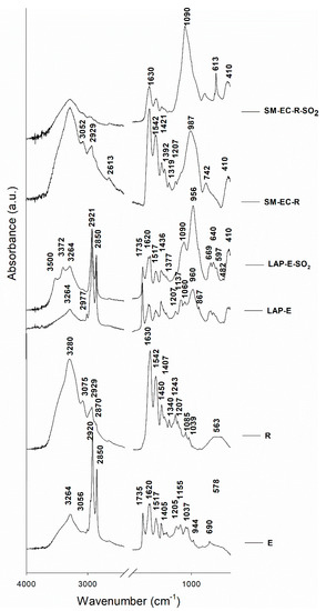 After the SO2 test (Figure 4), the following bands that were assigned to the S–O group were detected in the FTIR spectra for the aged mock-ups: i) in LAP-E-SO2, LAP-R-SO2, SM-C-E-SO2, and SM-EC-E-SO2, a strong band at 1090 cm−1 assigned to S–O stretching, and ii) in all SM-based paints, an intense band at 613 cm−1 assigned to S–O bending vibration. In addition, in the aged LAP-based paints bands were identified at 3500 cm−1 and 3372 cm−1 and assigned to OH stretching of water. This pair of bands is characteristic of hydrated sulfated salts, especially gypsum [66]. Therefore, these findings confirm the XRD results indicating the presence of hydrated sulfated salts, such as those identified in aged LAP-paints, namely gypsum, bassanite, and pentahydrite.