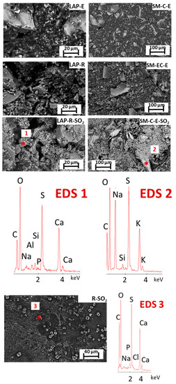 Figure 5. Scanning electron microscope (SEM) micrographs and energy-dispersive X-ray spectroscopy (EDS) spectra of LAP- and SM-paint mock-ups, before and after the SO2 aging test. Also shown is the SO2 aged rabbit glue (R) mock-up. Check Table 1 to better follow the paints labeling. –SO2 shows the aged samples.