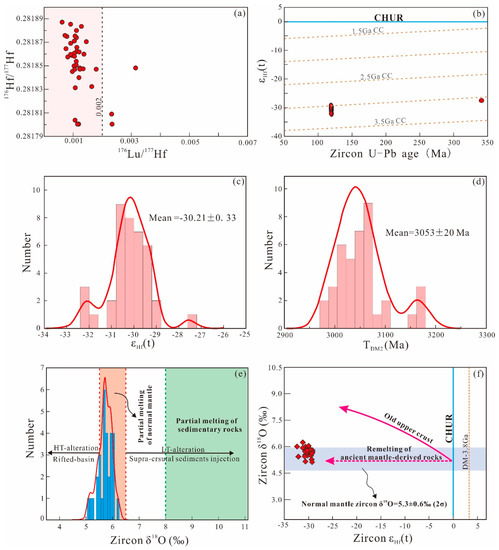 - Griffin, W.L.; Wang, X.; Jackson, S.E.; Pearson, N.J.; O’Reilly, S.Y.; Xu, X.; Zhou, X. Zircon chemistry and magmamixing, SE China: In-situ analysis of Hf isotopes, Tonglu and Pingtan igneous complexes. Lithos 2002, 61, 237–269. [Google Scholar] [CrossRef]