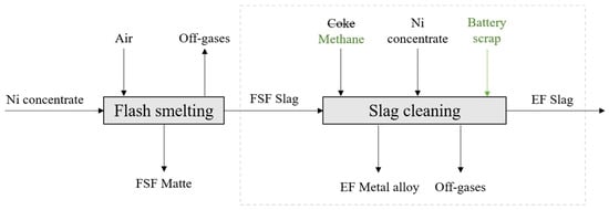 A simplified flowchart of nickel flash smelting (DON) and slag cleaning. The box drawn with dashed lines indicates the focus area of this study. In this work, coke was replaced with methane and battery scrap was added as part of the feed material mixture.