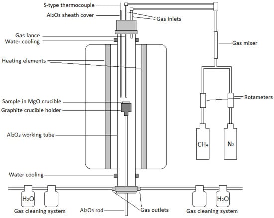 Gases (N2, purity of 99.999% and CH4, purity of 99.5%, from AGA Linde, Finland) were injected from the top of the furnace either into the working tube or as top-blowing to the sample through an alumina tube acting as a lance (2 mm ID) (Figure 2). Rotameters (Kytola Instruments, Muurame, Finland) were used for regulating the gas flow rates. A multiple gas outlet piece was connected to the bottom part of the furnace and to two gas cleaning systems. The first bottles of the gas cleaning systems were empty, and the second bottles contained H2O. The samples were held in MgO crucibles (SC10012, 20/32 mm ID/H, Tateho Ozark Technical Ceramics, Webb City, MO, USA) during the experiments.