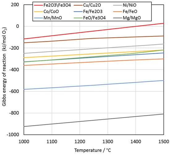 The thermodynamic stability of pure metal oxides at 1000–1500 °C was calculated with HSC Chemistry software (version 6.12, Outotec, Finland). According to the Ellingham diagram in Figure 3, the reduction of metal oxides at 1400 °C occurs in the following order: Fe2O3/Fe3O4, Cu/Cu2O, Ni/NiO, Co/CoO, FeO/Fe3O4, Fe/Fe2O3, Fe/FeO, Mn/MnO, and Mg/MgO.