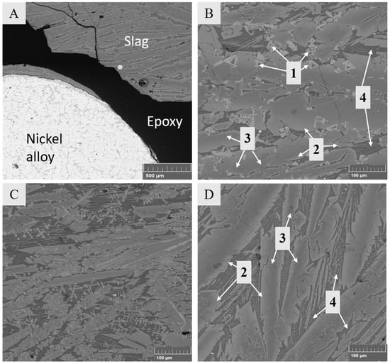 Microstructures of solidified samples with LiCoO2–MnO additives. (A) General overview after 5 min of reduction; (B) slag before reducing conditions (0 min) with marked phases 1–4; (C) slag after 2.5 min; (D) slag after 20 min.