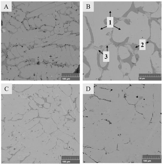 Microstructure of the solidified metal alloy with added LiCoO2–MnO mixture after (A) 2.5 min, (B) 5 min, (C) 10 min, and (D) 20 min of reduction.