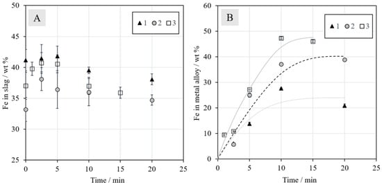 Concentrations (wt %) of iron in (A) slag and (B) metal alloy during reduction with N2 + 5% CH4.
