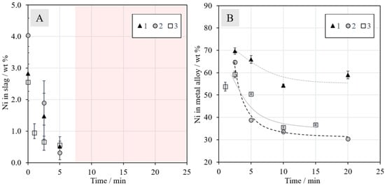 Concentrations (wt %) of nickel in the (A) slag and (B) metal alloy as a function of reduction time in N2 + 5% CH4 mixtures. No experimental points are shown after 5 min of reduction for nickel, since its concentration in the slags was under the detection limit of EDS; this has been indicated with the shaded area in Figure 8A.
