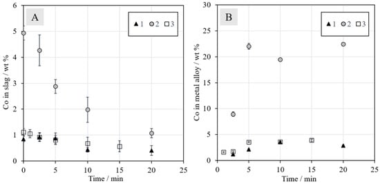Concentrations (wt %) of cobalt in the (A) slag and (B) metal alloy as a function of time in N2 + 5% CH4 mixtures.