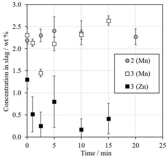 The concentrations of manganese and zinc in the metal alloy were low and therefore, only the concentrations in slags are shown in Figure 10. The concentration of Mn increases slightly with an increasing reduction time due to the reduction of other oxides from the slag. It should be noted that Mn was only present in Series 2 and 3 when synthetic MnO and industrial battery scrap were added, respectively. In Series 1, the mixture did not contain Mn and the concentration was negligible.