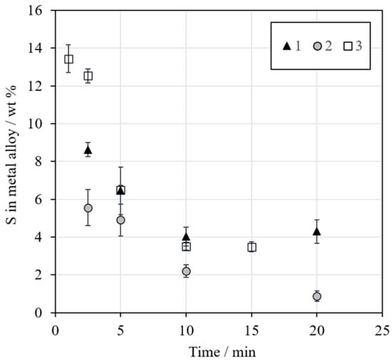 Figure 11 shows the concentration of sulfur in the metal alloy as a function of reduction time. The concentration decreased with an increasing time in all series, which is in line with the visual observations of the sample microstructures in Figure 5. The aim was to have approximately 5 wt % sulfur in the final alloy, but the concentration decreased below that. The sulfur in the metal alloy may have reacted with the surrounding methane-containing atmosphere and formed, e.g., CS2 or H2S []. The high concentration of iron in the formed metal alloy was also not included in the calculations regarding the amount of concentrate addition.