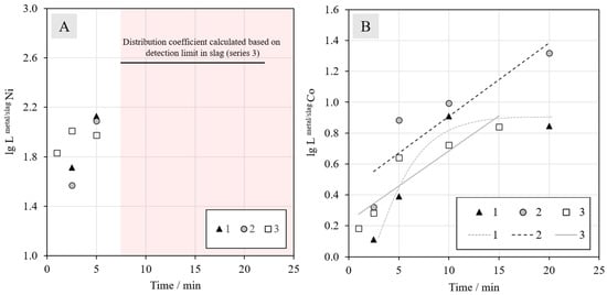 Distribution coefficients of (A) nickel and (B) cobalt between the metal alloy and slag at different reduction times with an N2 + 5% CH4 gas mixture. For nickel, the values after 5 min are not shown, because the concentrations in slag were under the detection limits of EDS.