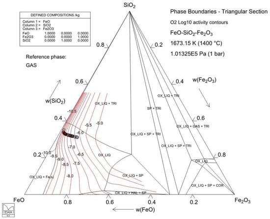 Isothermal section of the SiO2–FeO–Fe2O3 slag equilibrium system at 1400 °C. The black circles refer to the calculated slag compositions based on the initial composition of Series 3. The red lines are oxygen isoactivity contours (and their labels are the log10 of oxygen partial pressure/atm) calculated with MTDATA software and the MTOX 8.2 database []. The phase labels are COR = Fe2O3, HAL = FeO, OX_LIQ = slag, SP = Fe3O4, and TRI = tridymite (SiO2).