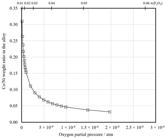 Figure 14 shows the Co:Ni ratio calculated for the forming metal alloy as a function of the oxygen partial pressure and magnetite content in the same slag depicted in Figure 13. In this study, for Series 1, the ratio after 2.5 min of reduction was approximately 0.01 and after 20 min, it was approximately 0.04. For Series 2, the ratios were approximately 0.14 and 0.83, respectively. For Series 3, the corresponding ratios (after 2.5 and 15 min) were approximately 0.03 and 0.08. Based on these values, the oxygen partial pressure (Figure 14) is slightly lower in Series 3 compared to Series 1. In Series 2, the oxygen partial pressure is considerably lower, indicating that the reduction has progressed further. This is supported by the distribution coefficient values in Figure 12.