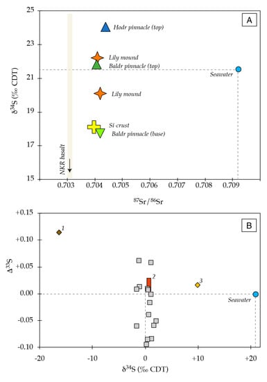 - Ono, S.; Shanks, W.C., III; Rouxel, O.J.; Rumble, D. S-33 constraints on the seawater sulfate contribution in modern seafloor hydrothermal vent sulfides. Geochim. Cosmochim. Acta 2007, 71, 1170–1182. [Google Scholar] [CrossRef]