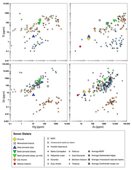 - Binns, R.A.; Parr, J.M.; Gemmel, J.B.; Whitford, D.J.; Dean, J.A. Precious metals in barite-silica chimneys from Franklin Seamount, Woodlark Basin, Papua New Guinea. Mar. Geol. 1997, 142, 119–141. [Google Scholar] [CrossRef]