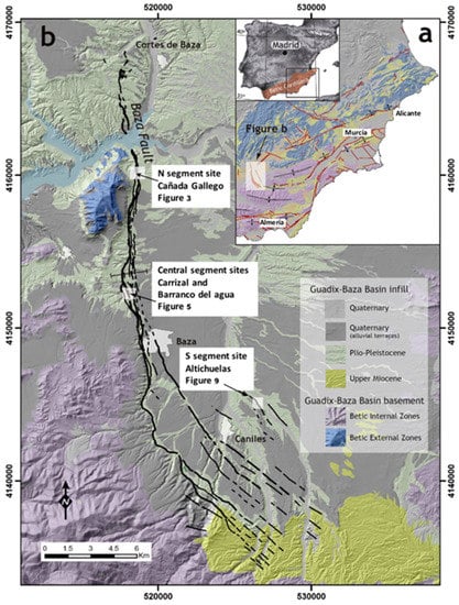 The Baza Fault is located in the Guadix-Baza basin (central Betic Cordillera, Figure 1). In this region, convergence between Nubia and Eurasia has a rate of approximately 4 to 6 mm/yr [56]. The main tectonic feature of the area is an ENE–WSW extension that has produced dip normal faults since the Miocene [47]. The main active structure of the Guadix-Baza basin is the Baza Fault (Figure 1b), one of the most important active normal faults of the Betic Cordillera with 37 km of extension, a N–S to NW–SE strike and 45°–65° dipping to the east [55,57]. In the northern part of the fault, it has one main strand and fault zone is ca. 0.2 km width. However, more than 13 strands can be observed in the southern part of the fault zone, with a width of ca. 7 km. Since the late Miocene, accumulated total fault throw is around 2 km [55]. The estimations of the slip rate of the fault vary between 0.12 [44,55] to 0.49 mm/yr [57].
