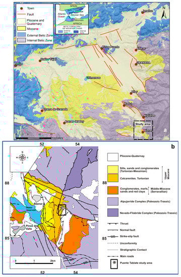 (a) Geological sketch of the Granada Basin and the Betic Cordillera, southern Spain. (b) Geological map of the study area. Location of the area is indicated in (a). Modified from Sanz de Galdeano [71].