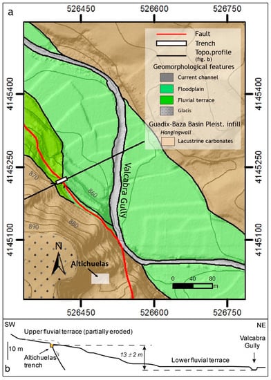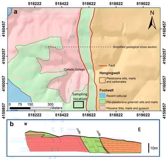 (a) Geological–geomorphological map of the central sector of the Baza Fault. Location in Figure 1. (b) Geological cross section along the southern sector. Modified from Castro and collaborators [63].