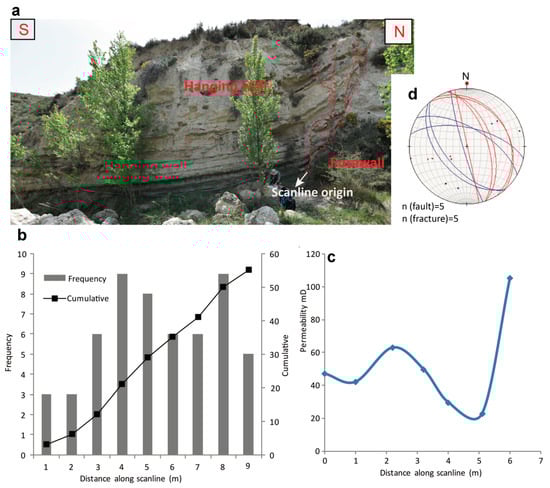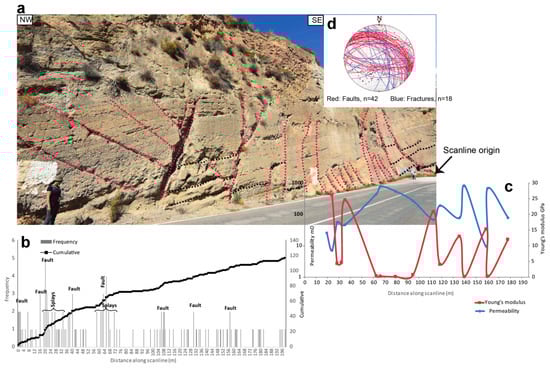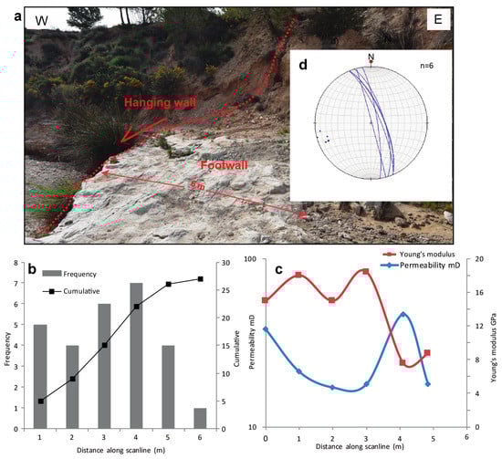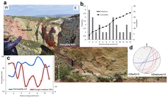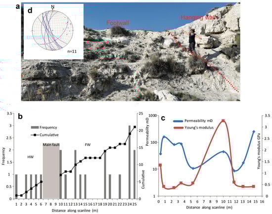 (a) A photo of the northern segment of the Baza Fault (Cañada Gallego site). Note that the scanline measurements were conducted in the hanging wall of this fault. (b) Frequency and cumulative distribution of fractures. (c) Permeability and Young’s modulus measurements along the scanline. (d) Stereoplot of the fault (red) and fracture (blue) orientations.