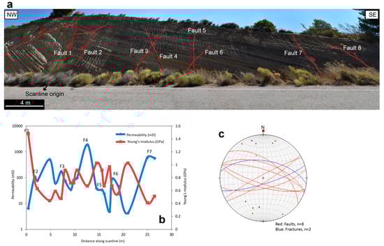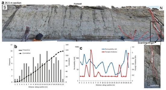 (a) Section 1 in Altichuelas site (southern segment of the Baza Fault), where the first scanline was conducted at the base of the outcrop. Note the fault in the northern corner of this outcrop with a clay smear and many cavities/dissolution features around the fault. The scanlines were conducted in the footwall damage zone of this fault. There are several small faults, illustrated with red dashed lines that are either synthetic or antithetic to the orientation of the main fault. (b) Frequency and cumulative distribution of fractures along the scanline. (c) Permeability and Young’s modulus estimations along the scanline.