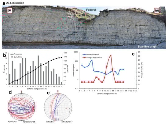 (a) Section 2 in Altichuelas site (southern segment of the Baza Fault), where the second scanline was conducted at the base of the outcrop. Note that there are only fractures observed in this section, which is part of the main fault footwall damage zone. (b) Frequency and cumulative distribution of fractures along the scanline. (c) Permeability and Young’s modulus estimations along the scanline. (d) and (e) stereoplots of faults (red) and fractures (blue) in Sections 1 and 2, respectively.