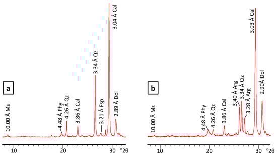 Representative XRD patterns of samples from the damage zones of the Baza Fault (Altichuelas site). (a) Calcite-rich samples from portions of non-deformed lithotypes. (b) Aragonite and dolomite-rich samples with low permeability values. Cal: Calcite, Dol: Dolomite, Arg: Aragonite, Qz: Quartz, Fsp: Feldspars, Phy: Phyllosilicates, Ms: Muscovite. Mineral abbreviations according to Whitney and Evans [80].