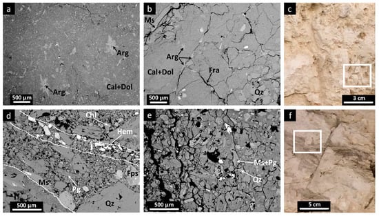 Petrography of samples from the damage zones of the Baza Fault. (a,b): Carbonatic lithofacies made of a micritic matrix of dolomite and calcite with a disconnected fracture network filled by aragonite (Altichuelas site). (c) Outcrop picture showing the macroscopic fractures of the sample; square indicates the area of the SEM images (a) and (b). (d,e) Detrital silicate deformation bands made of quartz, alkali feldspars, Fe oxides/hydroxides and phyllosilicates (muscovite, paragonite, chlorite) (Carrizal site). (f) Outcrop picture showing the macroscopic fractures of the sample; square indicates the area of the SEM images (d) and (e). Cal: Calcite, Dol: Dolomite, Arg: Aragonite, Qz: Quartz, Ms: Muscovite, Pg: Paragonite, Chl: Chlorite, Hem: Hematite, Fps: Feldspar, Fra: Fractures. Mineral abbreviations according to Whitney and Evans [80].