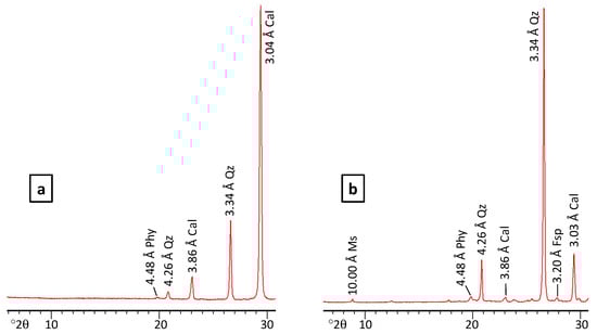 Representative XRD patterns of samples from the Tablate area in the southeastern edge of the Granada Basin. (a) Calcite-rich samples from calcarenite beds. (b) Quartz-rich grey sands. Cal: Calcite, Qz: Quartz, Fsp: Feldspars, Phy: Phyllosilicates, Ms: Muscovite. Mineral abbreviations according to Whitney and Evans [80].