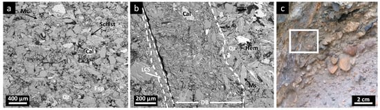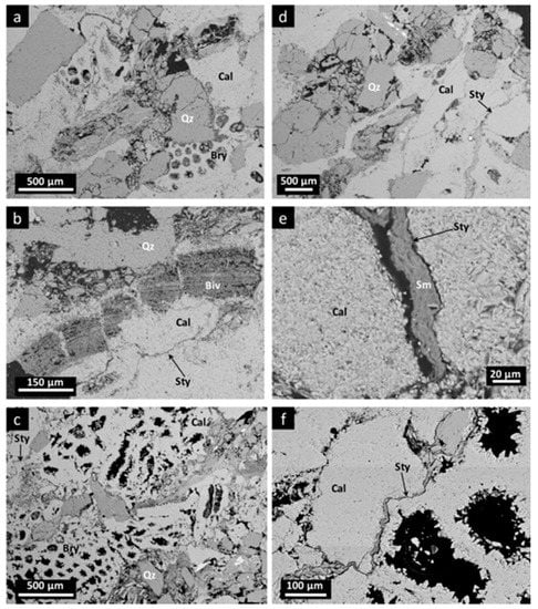 Micrograins from matrix are anhedral, and they do not show preferred elongation or crystal orientation (Figure 13a,b), their boundaries are irregular, resulting in an isotropic, compact microstructure. Figure 13c shows an outcrop picture with the macroscopic fractures of the sample. Coarser calcite has been found only within fossils. Grain size is broadly constant in all the site samples, except for those richer in detrital silicates (Altichuelas and Carrizal, Figure 13d,e) where massive matrix hosts irregular bands made of irregular quartz clasts, alkali feldspars and detrital crystalline phyllosilicate lamellae, up to 200 μm in size (muscovite, paragonite, chlorite). These bands are deformation band (cataclastic bands) formed during the faulting process of poorly consolidated sediments and involve cataclasis or grain breakage (e.g., [81,82]). Euhedral crystals or perfectly rounded clusters of Fe oxides/hydroxides and sulphides, from submicrometre to 20 μm in size can also be found. Figure 13e shows an outcrop picture with the macroscopic fractures of the sample. A pattern of disconnected fracture network is developed in many of the carbonatic lithofacies samples, suggesting preferential flow through the fractures. Microsealing by precipitation of aragonite (Altichuelas site) or dolomite (Barranco del Agua W) filling fractures occur through this vein network associated to deformation bands (Figure 13a,b).