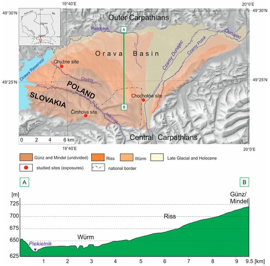 The relief of the Orava Basin is composed of a series of extensive and flat Pleistocene fans and Holocene terraces of the Czarny Dunajec River, dipping gently (3–5°) to the north. Three glaciofluvial covers may be distinguished in the western part of the basin, at: 800–750 m a.s.l., 750–635 m a.s.l., and 635–615 m a.s.l. and these are correlated with the Tatra glaciations, the highest with the Günz/Mindel, the middle one with the Riss, and the lowest with the Würm (Figure 1). In Polish literature, the terms used for the Tatra glaciations are equivalents of the Alpine glaciations: Günz, Mindel, Riss, and Würm [29]. With regard to modern stratigraphy, they correspond to the following Marine Isotope Stages (MIS): Günz corresponds to MIS 21 to MIS 13; Mindel is commonly correlated with two different marine isotope stages, MIS 12 and MIS 10; the Riss is paralleled by MIS 6, 8 and 10, while the Würm is correlated with MIS 2–5d [45,46,47]. A Late Glacial alluvial fan located at altitudes of 750–600 m a.s.l. is present in the eastern part of the Orava Basin [22,23,25] (Figure 1). The bottom of the present-day river channel lies at altitudes between 600 m a.s.l. (northern part of the basin) and 700 m a.s.l. (southern part of the basin).